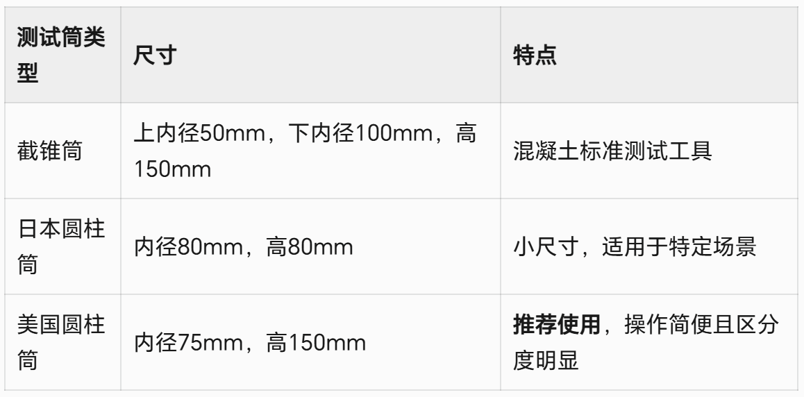 不同測試筒類型和尺寸會影響流動度結(jié)果,常見類型包括: